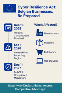 Pour les entreprises belges, les implications pratiques vont au-delà de la conformité. Les organisations qui adoptent ces exigences dès le départ constatent souvent que les principes de sécurité dès la conception améliorent la qualité globale des produits, réduisent les coûts de soutien à long terme et créent des avantages concurrentiels sur les marchés soucieux de la sécurité. À l’inverse, celles qui traitent la sécurité après coup s’exposent à des coûts de mise en conformité plus élevés et à des restrictions potentielles d’accès au marché.